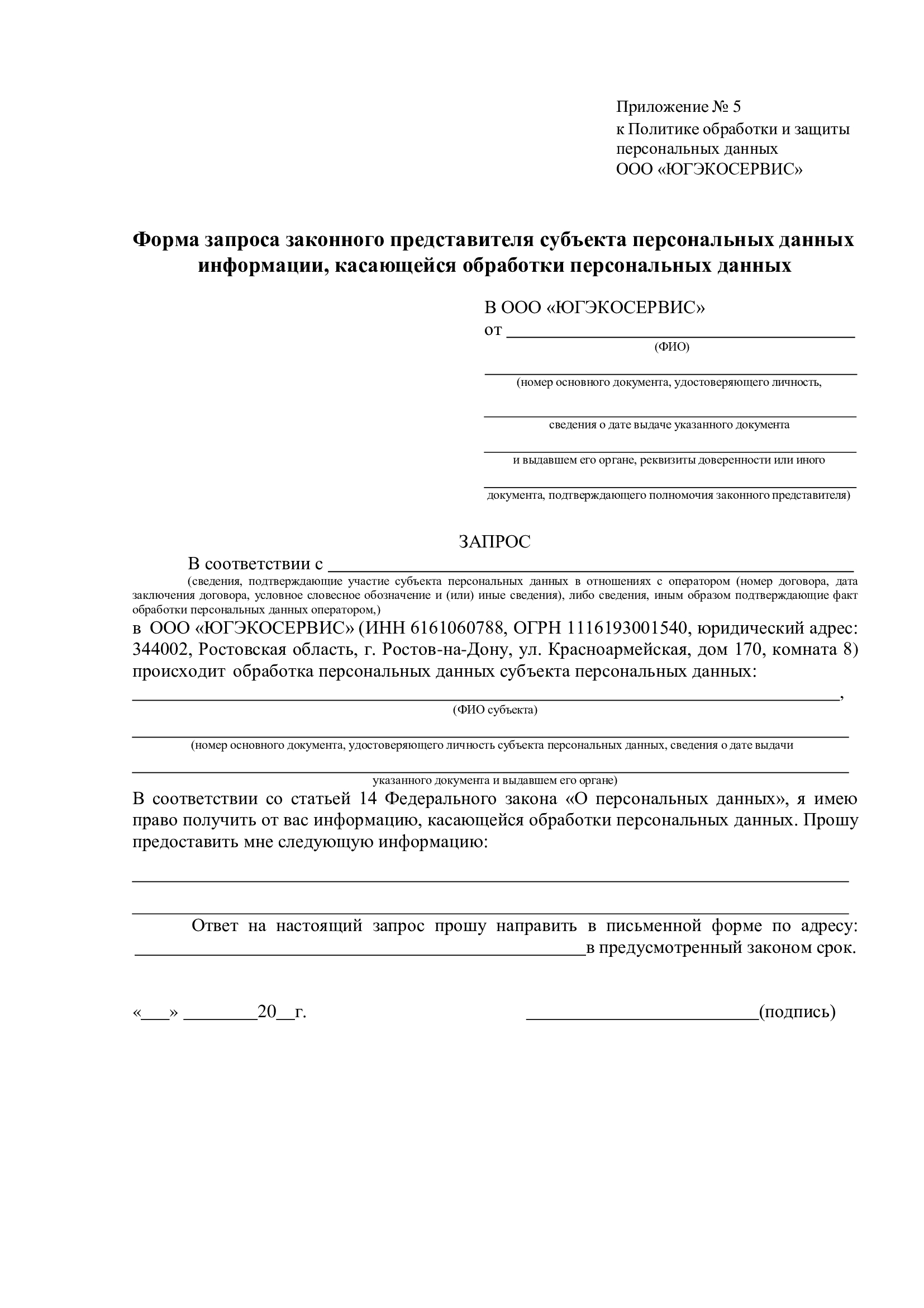 6.8. Для получения информации, указанной в п. 6.5.1, субъект (или его представитель) обязан заполнить форму запроса (Приложение 1 или 5) и направить его лично уполномоченным сотрудникам Общества либо почтовым отправлением.